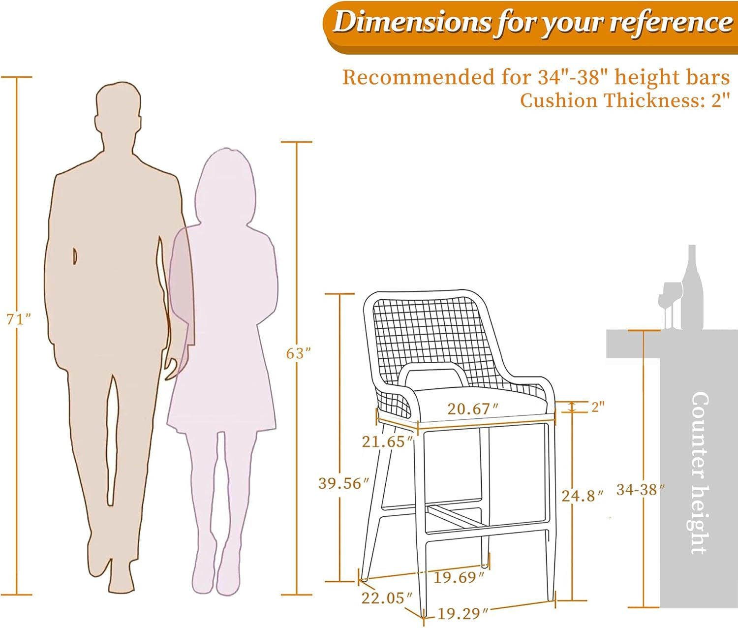 • Seating dimension: Includes 4 pieces bar stools (21.65"D x 20.67"W x39.56"H). 24.8" seat height is suitable for 34" - 38" height counters. Load capacity of each stool is 360 lbs.