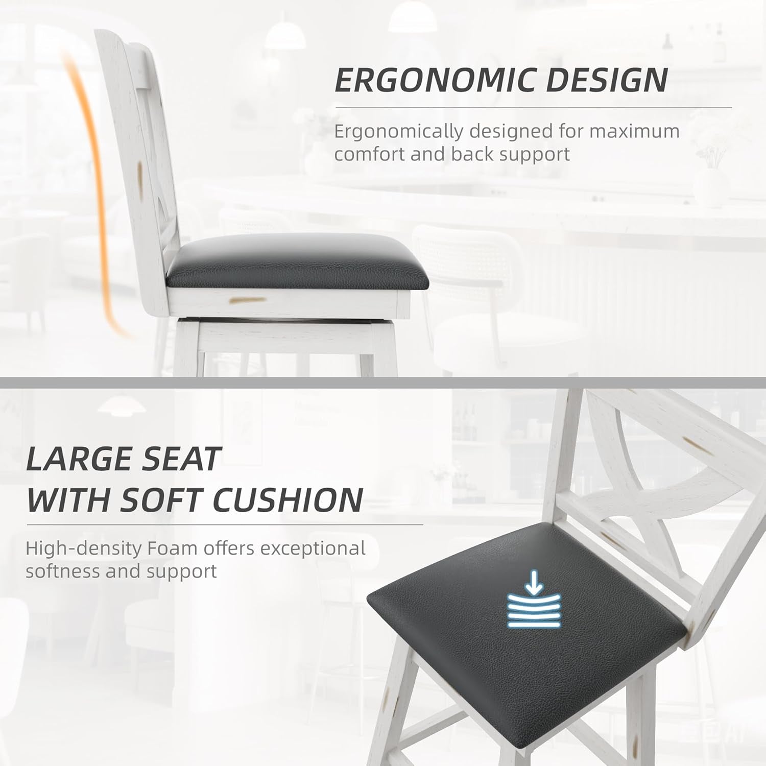 Swivel Bar Stools Set of 2, Swivel Barstools with Solid Footrest & Faux Leather Upholstered Seat, Island Chairs with Back for Kitchen, Dining Room (Antique White) (24-Inch)