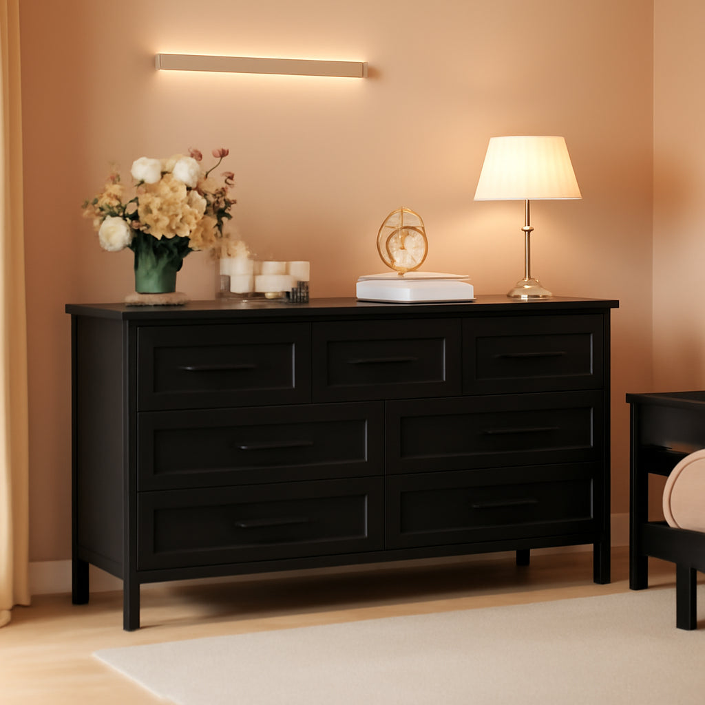 Transform clutter into calm with a black seven-drawer dresser designed for bedroom organization. This wooden farmhouse-style dresser combines generous storage with clean lines to elevate any room.