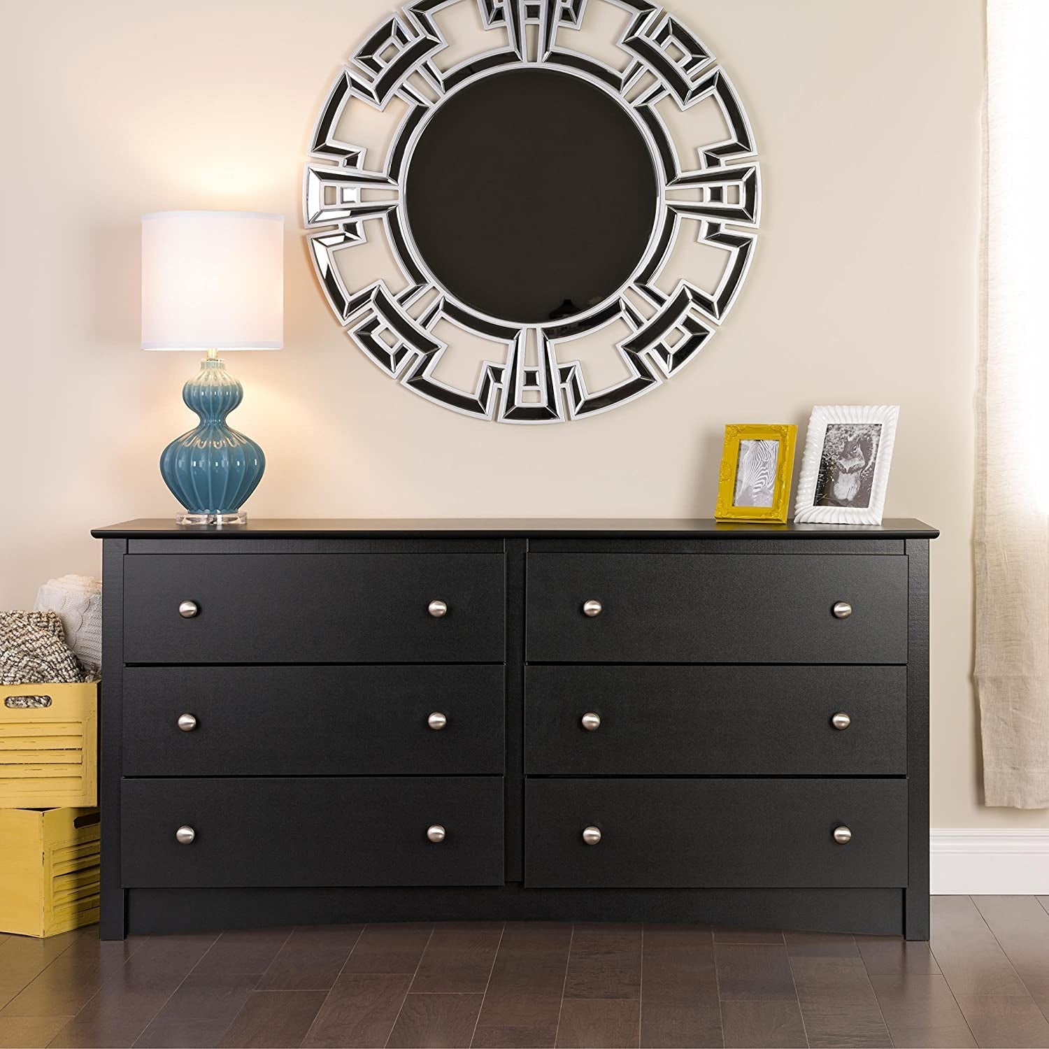 Put a modern spin on your classic staple with the Prepac Sonoma 6 Drawer Dresser. A profiled flat top, sleek side moldings, and curved kick plate lend to a charming and modern design with a black laminate finish that makes this a chic dresser for the bedroom. This double-column dresser houses six full-size drawers for clothes, running on smooth roller glides with built-in safety stops and brushed nickel metal knobs. This multi-drawer storage dresser is a space-saving clothes organizer for bedrooms, but it also acts as a storage cabinet in your walk-in closet, nursery, living room, or entryway. The hardy, flat top can also act as a TV stand or a display for small lamps, electronics, picture frames, and more. Made from a non-toxic laminated composite wood with a sturdy back panel for reliable storage, this high-quality dresser ships flat packed and can be assembled in two hours or less. Measuring 16" D x 59" W x 29" H with each deep drawer measuring 12.5" D x 24.75" W x 5" H, this horizontal double drawer dresser is a must-have piece of bedroom furniture. Pair this all-purpose dresser with other items from the Sonoma collection for a uniform bedroom set.