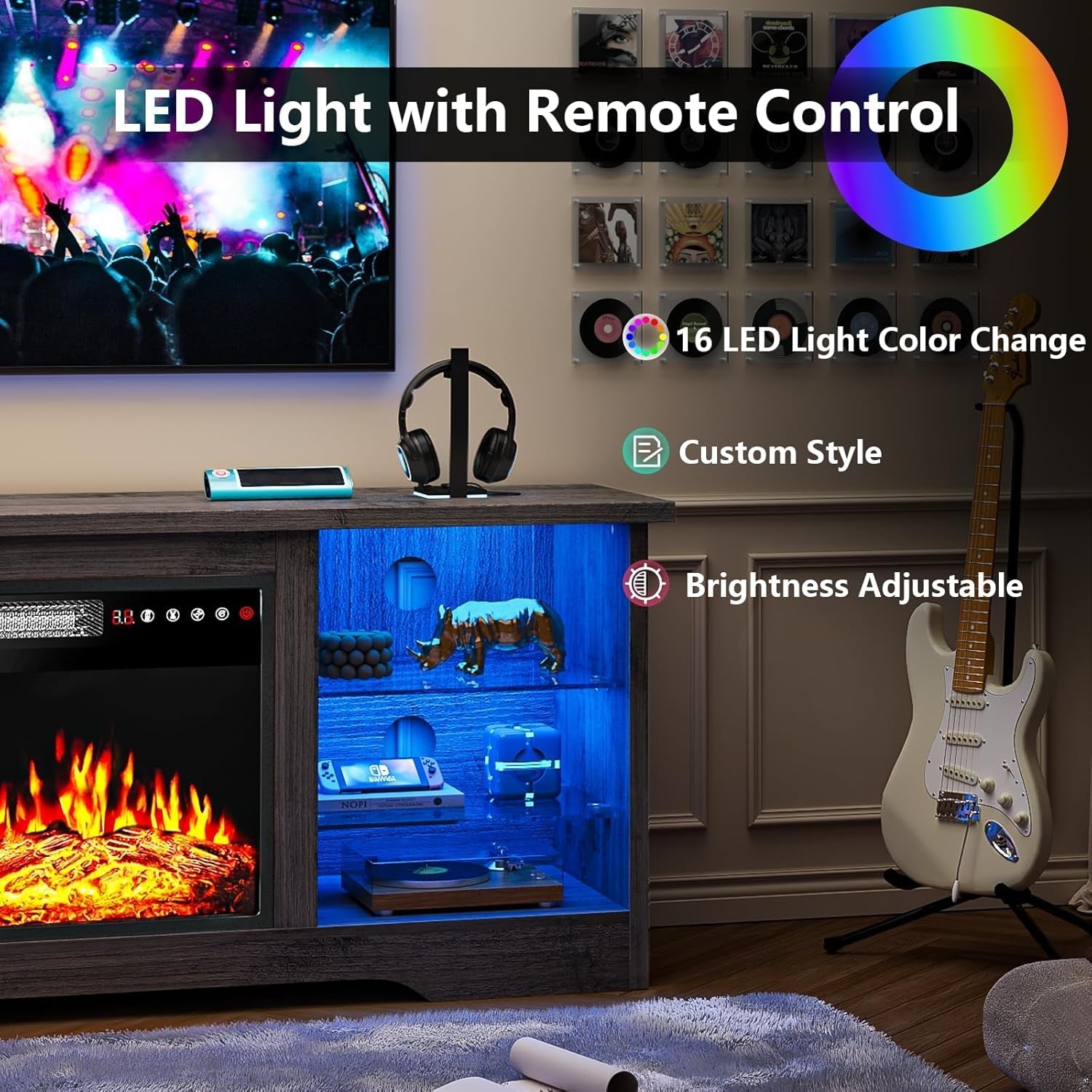 • [Adjustable TV Stand with Fireplace ]This TV station has two glass door cabinets and twomovable shelver. You can adjust the size of storage space as neededto meet your storageneeds. You can put your CDs, books, CDs, and other decorations you want. The cabinet isequipped with high-quality LED lights that can be changedinto 16 colors. You can use theremote control to change the color to match your mood and the atmosphere you want.