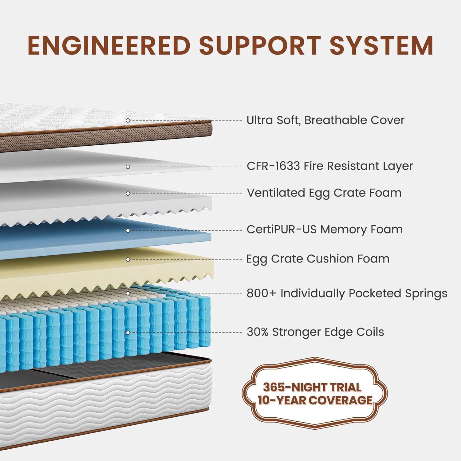 - Hybrid Construction: Combines the support of innerspring coils with the plush comfort of memory foam for the best of both worlds.