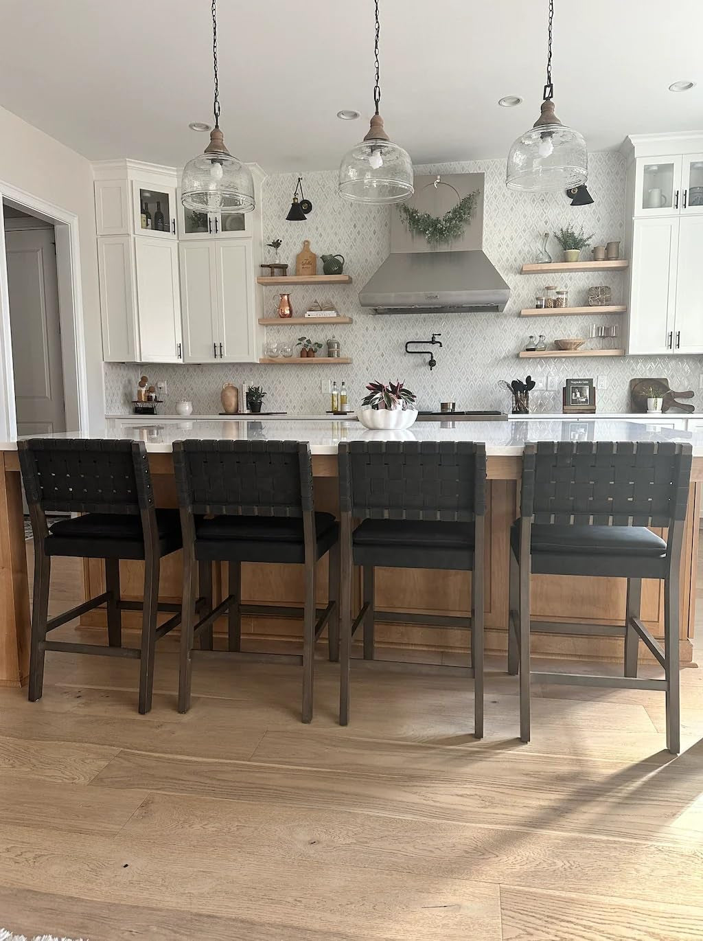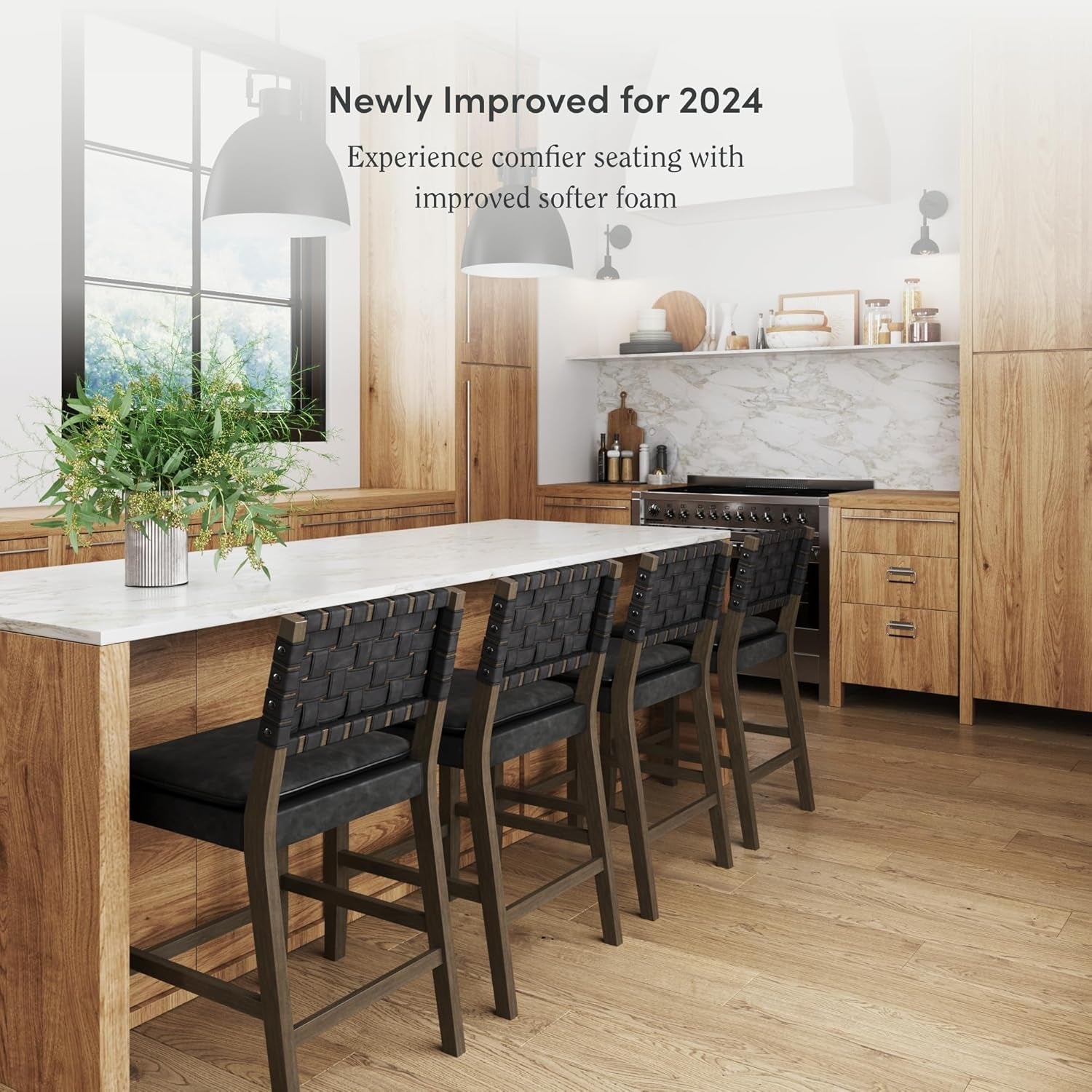 Meet Cohen, an upholstered leather barstool to add to your mid-century modern kitchen. The legs of this counter height stool are made from solid rubberwood with hard-wearing graphite wood finish. Complementing the beautiful frame is a cushioned saddle shaped seat upholstered in brushed black finish leather for your ultimate comfort. The seat has soft rounded edges for that cozy pillow look and feel. The Cohen counter stool also features a stylish woven back rest with luxurious stud details on both sides, making it a perfect accent piece in your bar area!